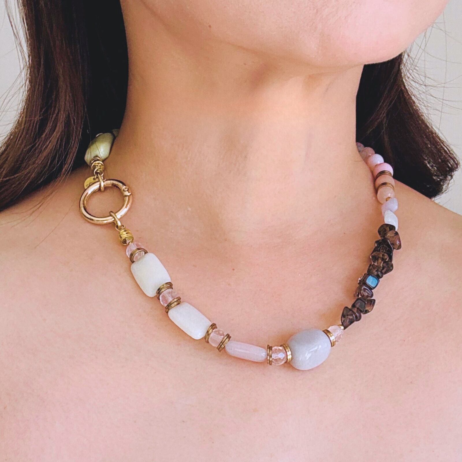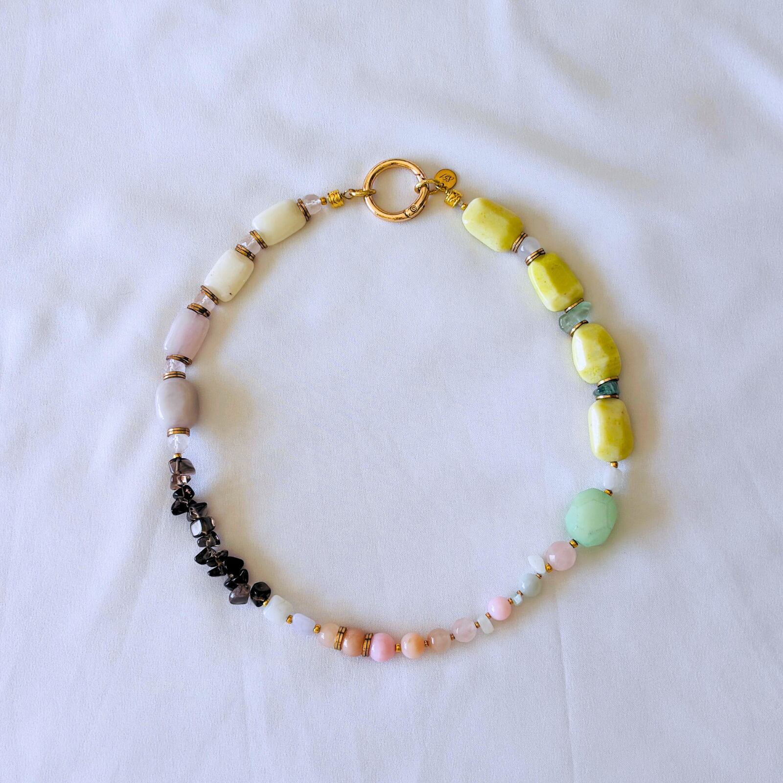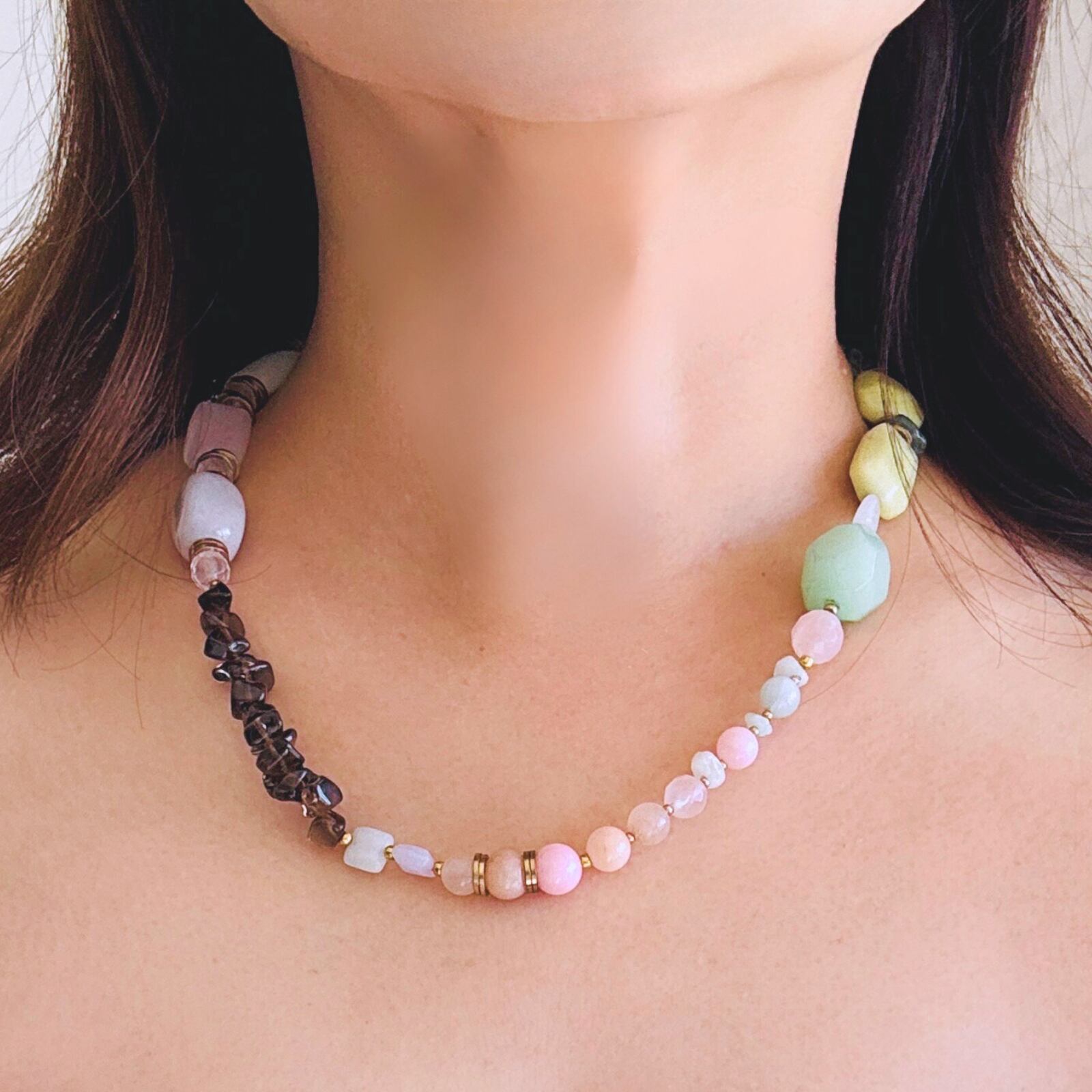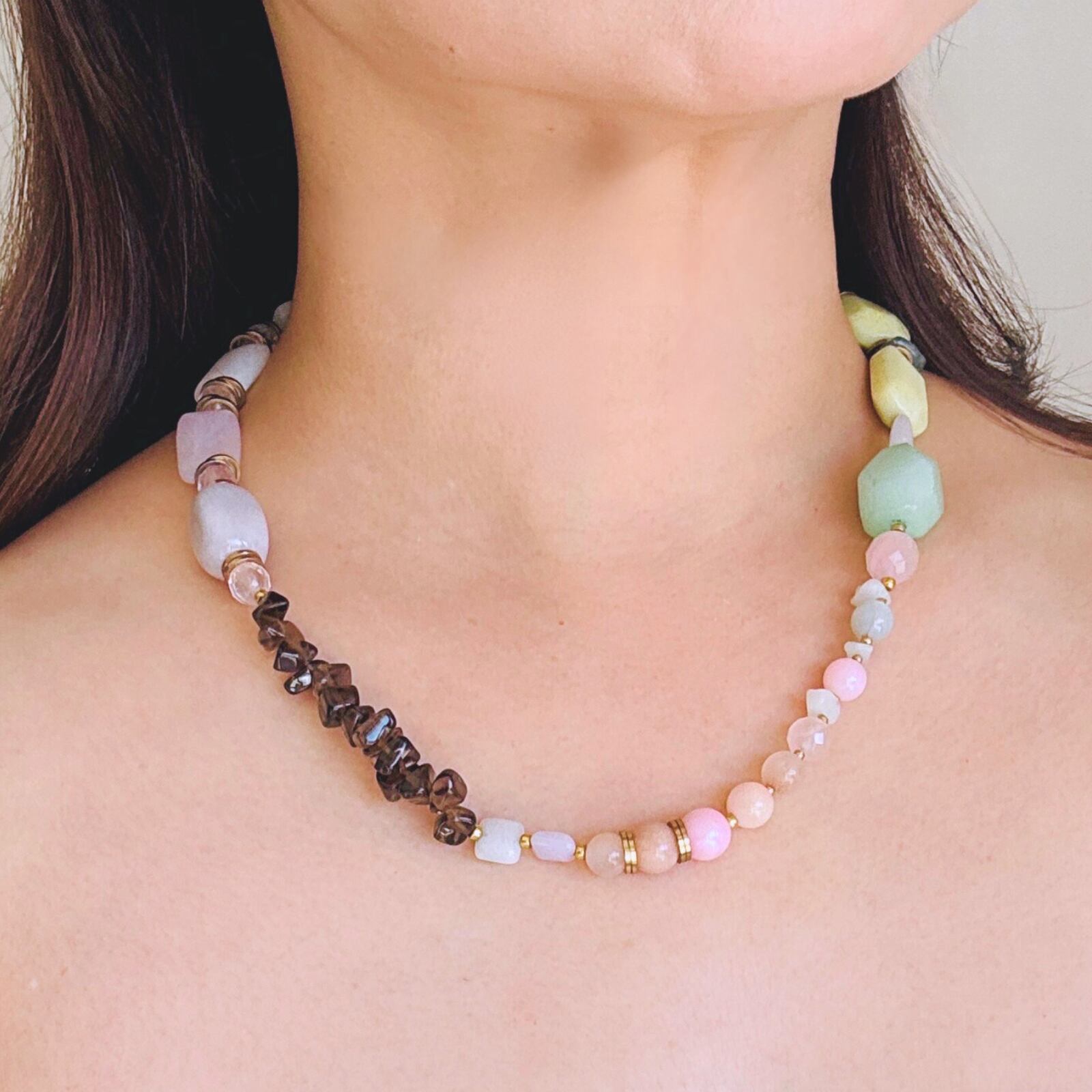 柔らかなマカロンカラーのカルセドニーを中心に、スモーキークォーツの深みを効かせた天然石ネックレス。