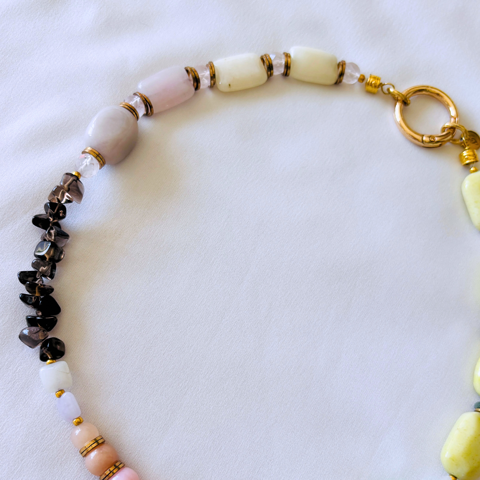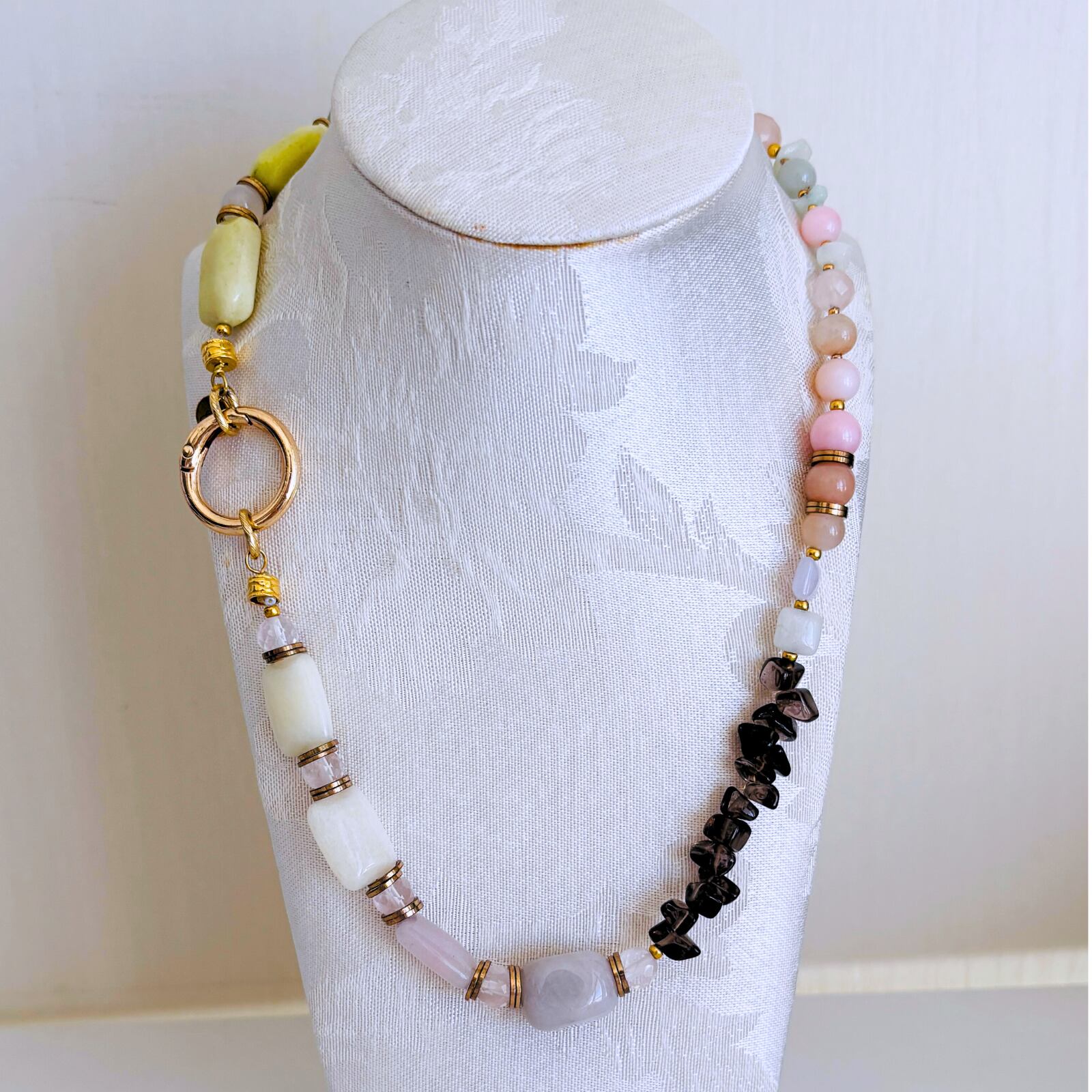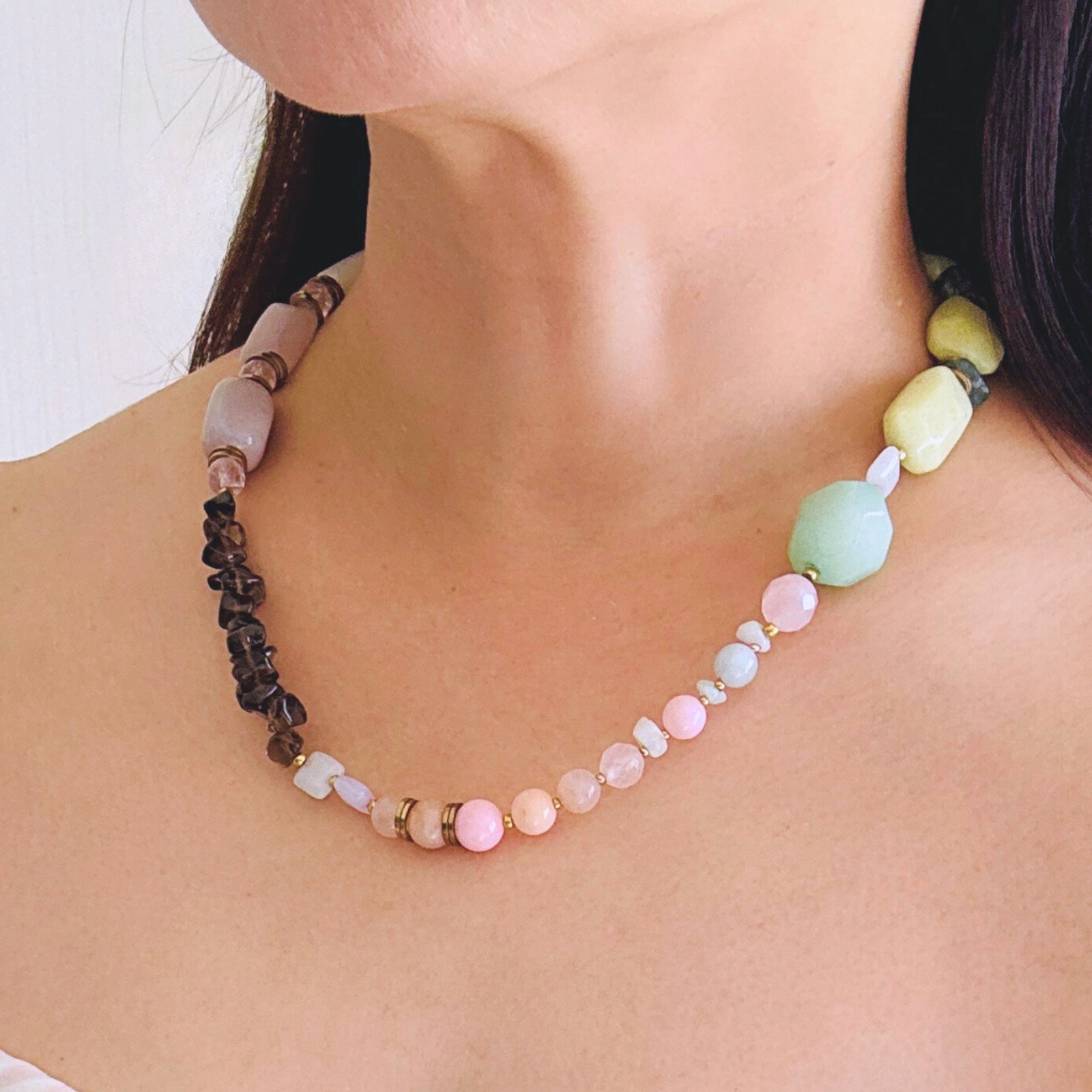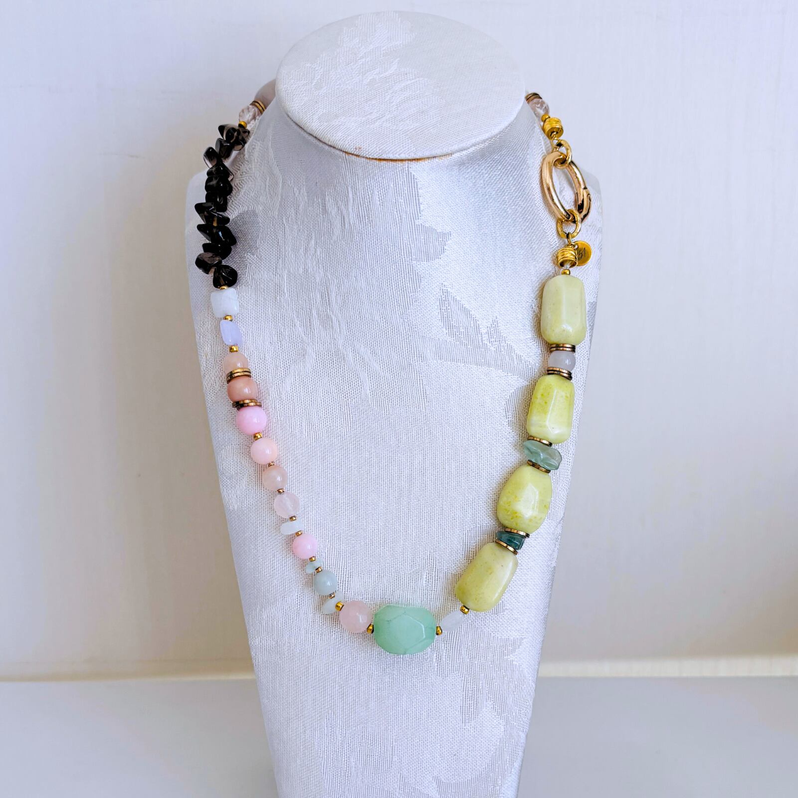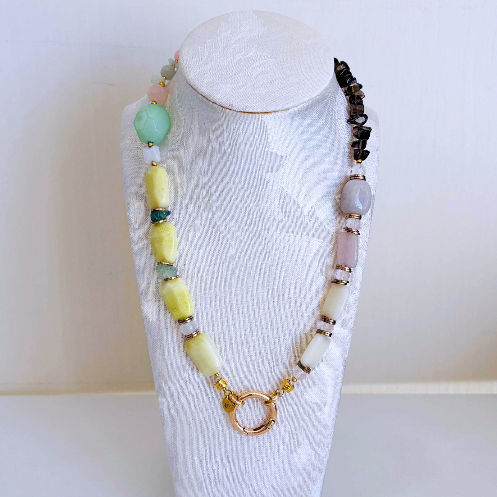 柔らかなマカロンカラーのカルセドニーを中心に、スモーキークォーツの深みを効かせた天然石ネックレス。