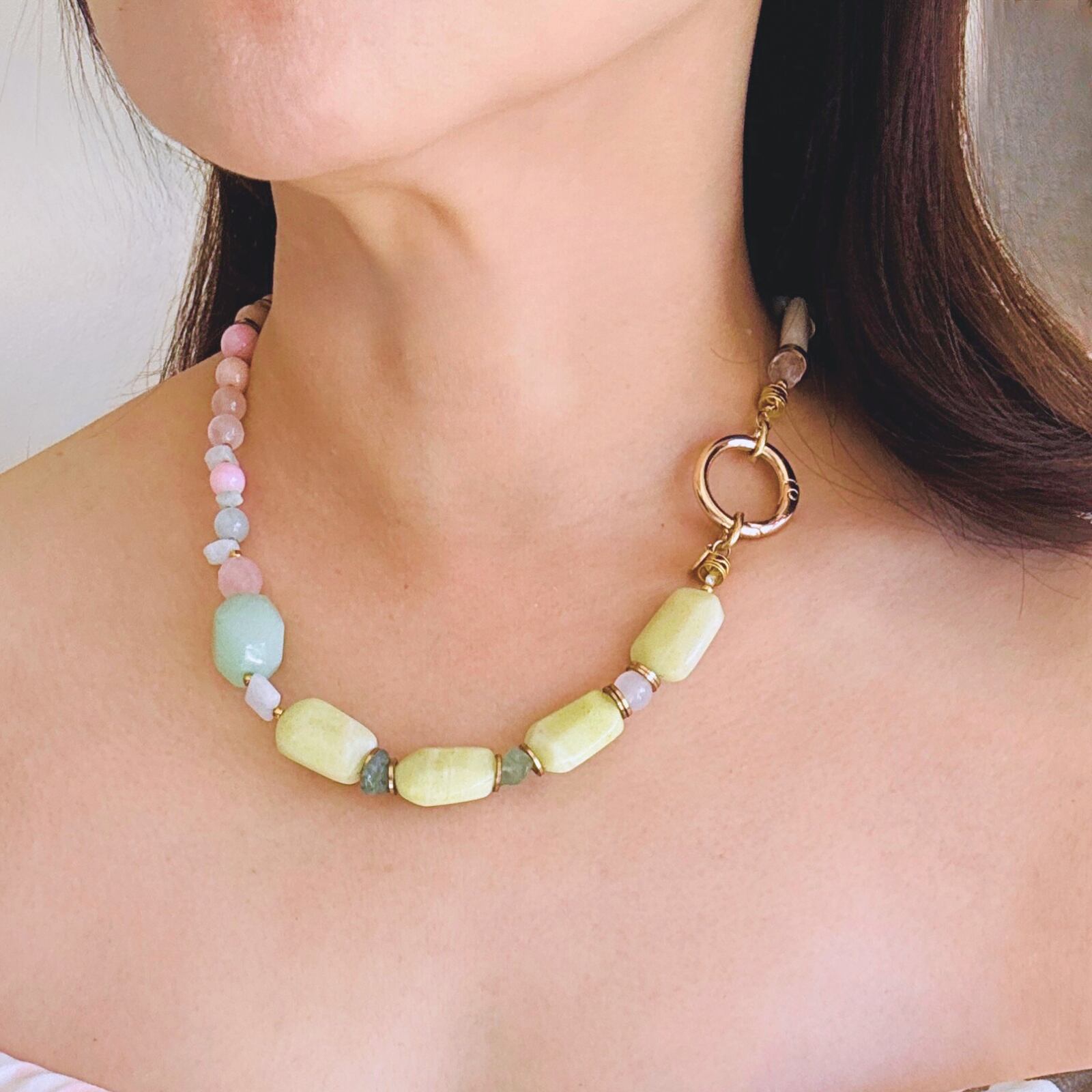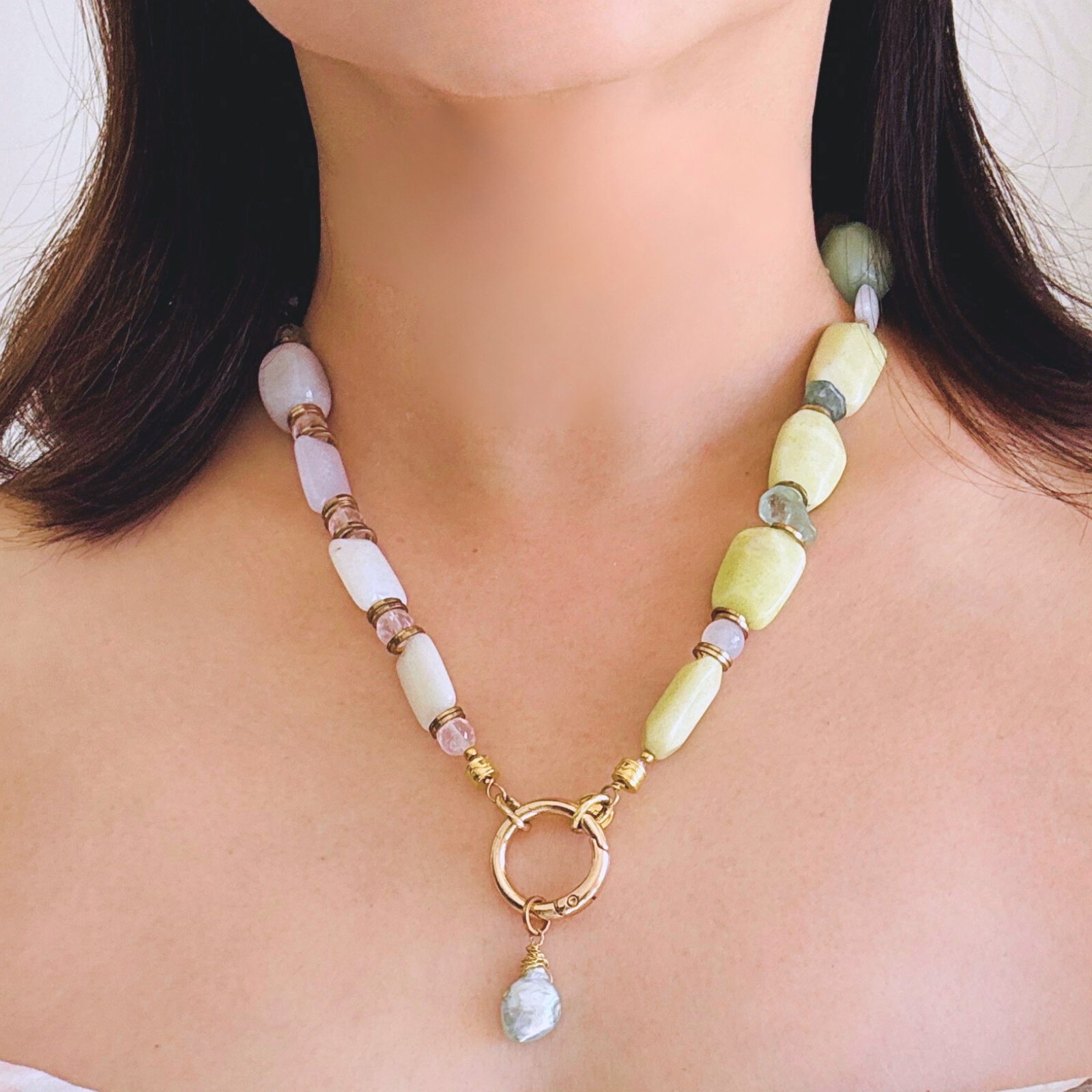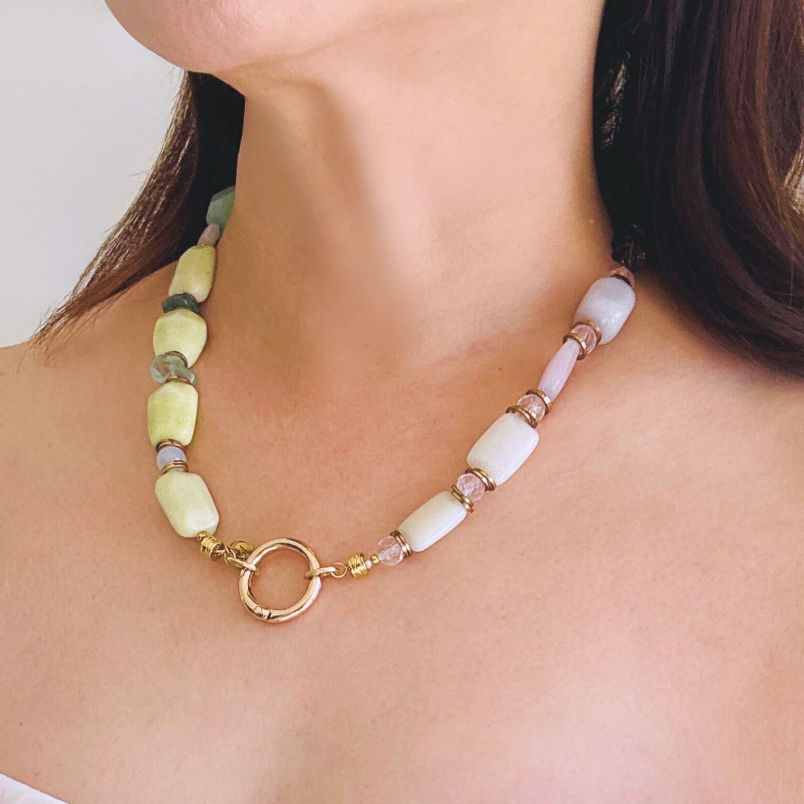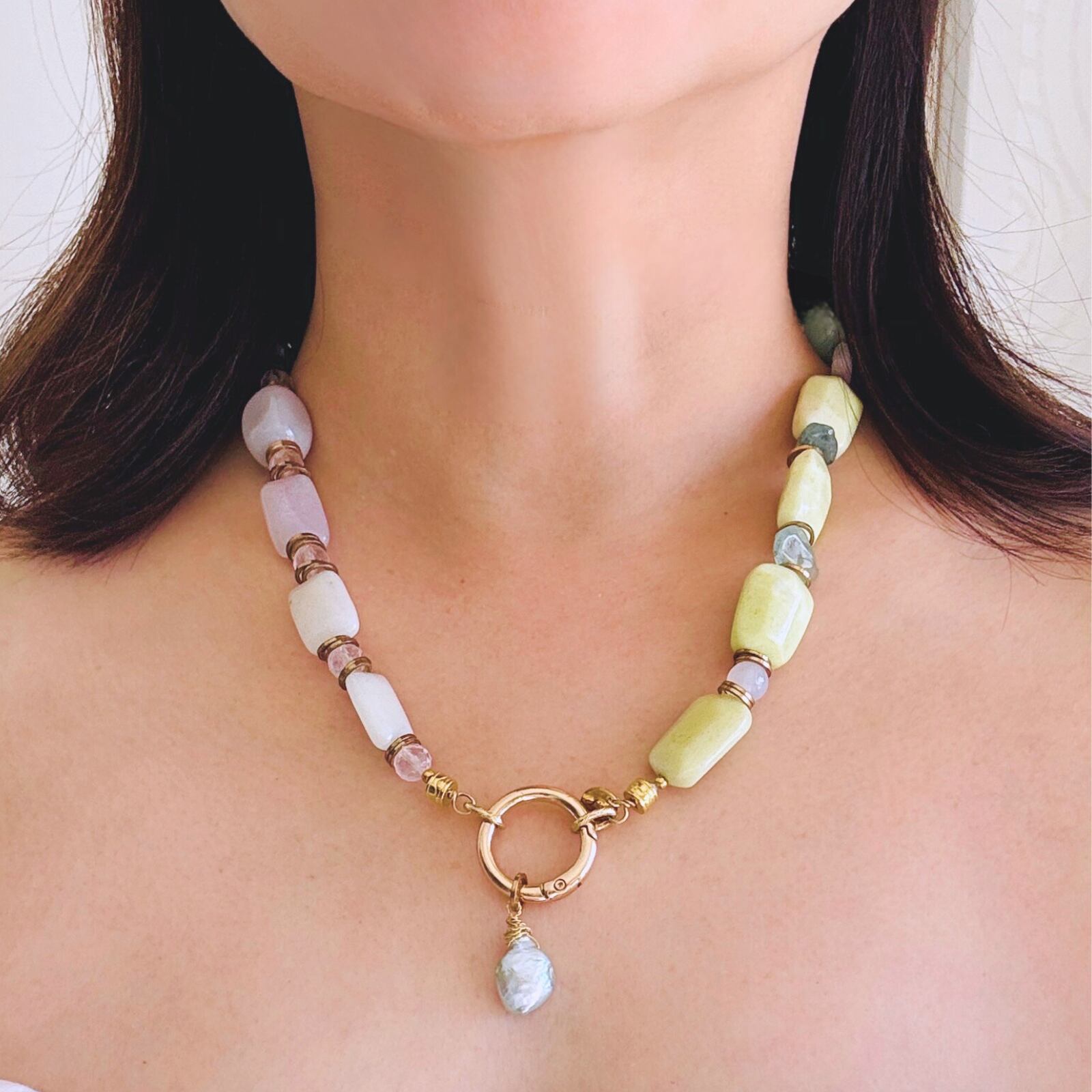 柔らかなマカロンカラーのカルセドニーを中心に、スモーキークォーツの深みを効かせた天然石ネックレス。
