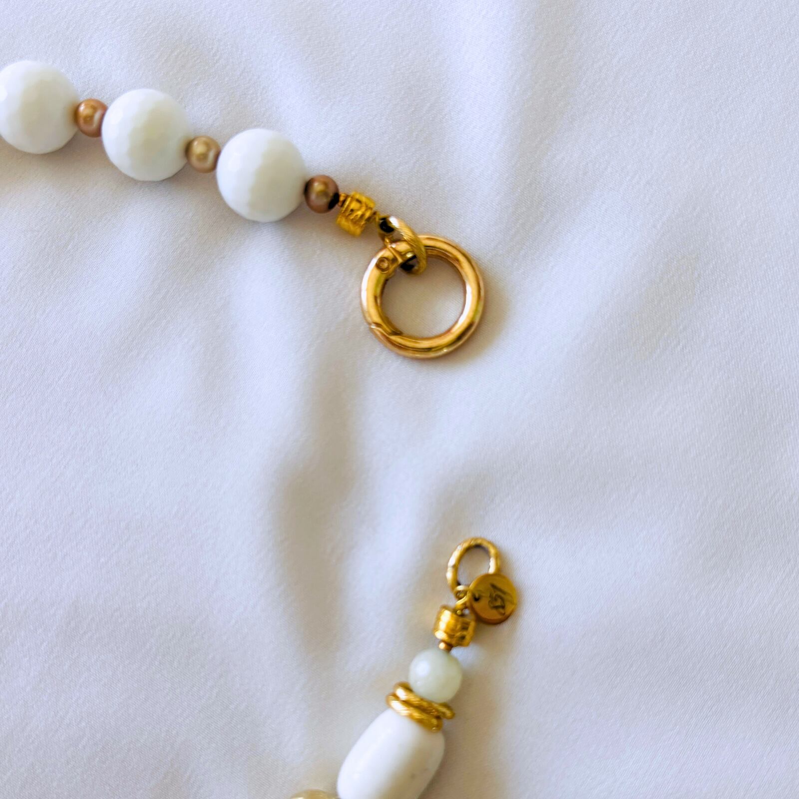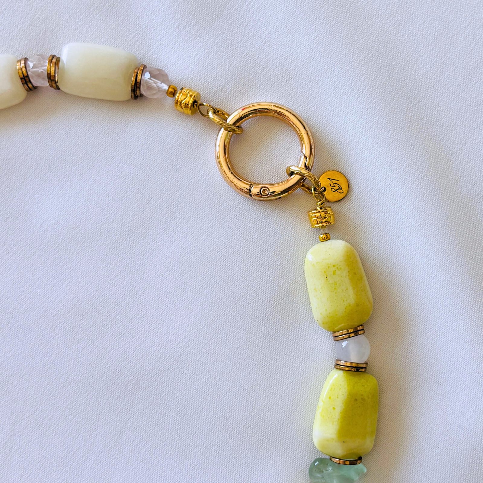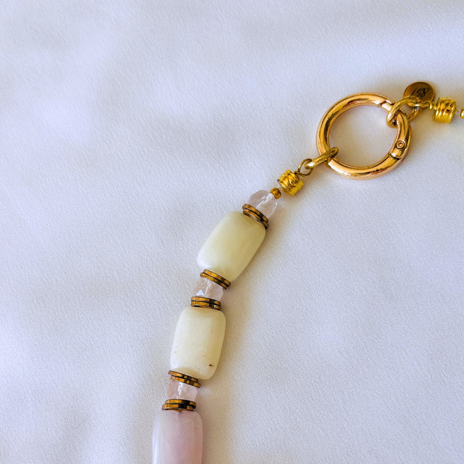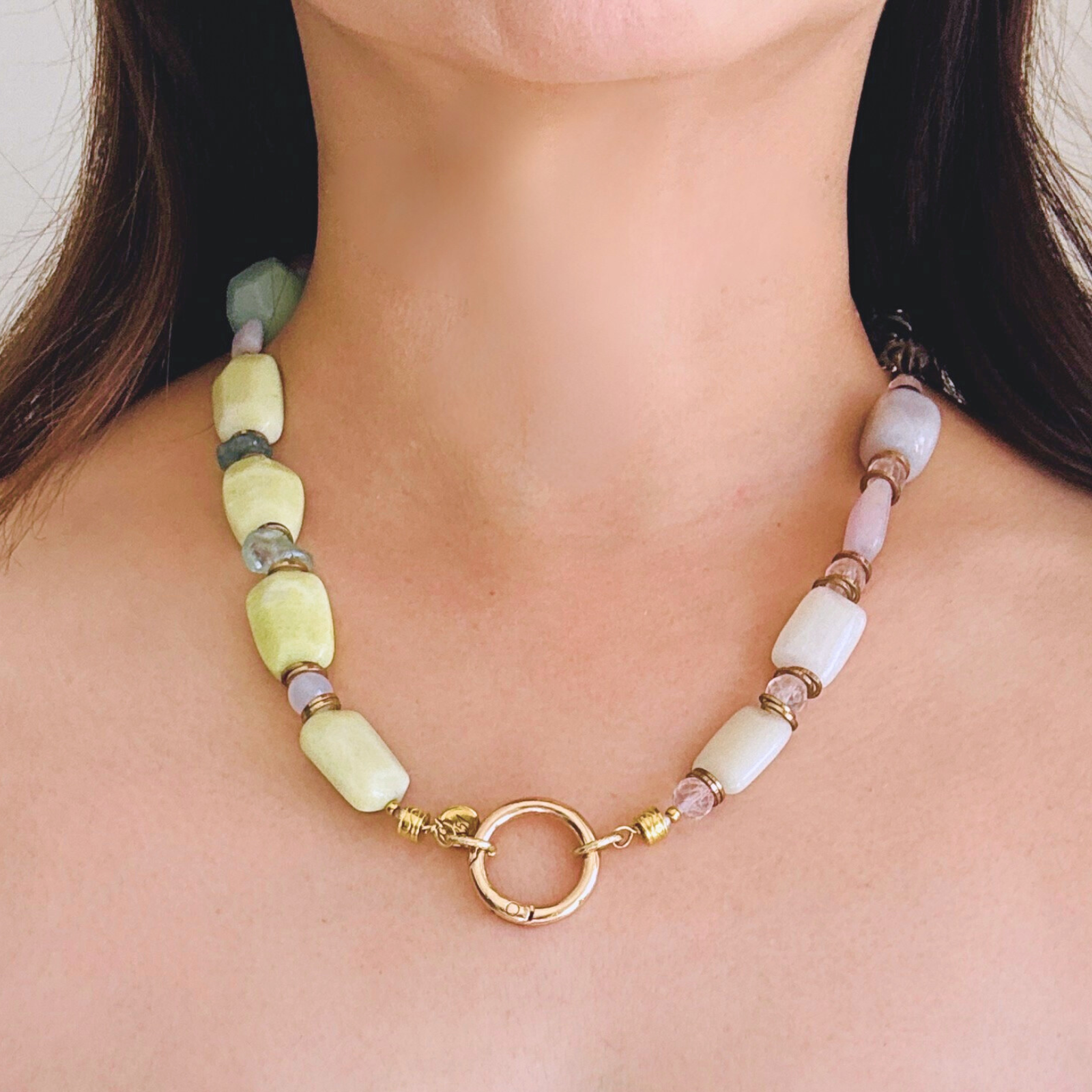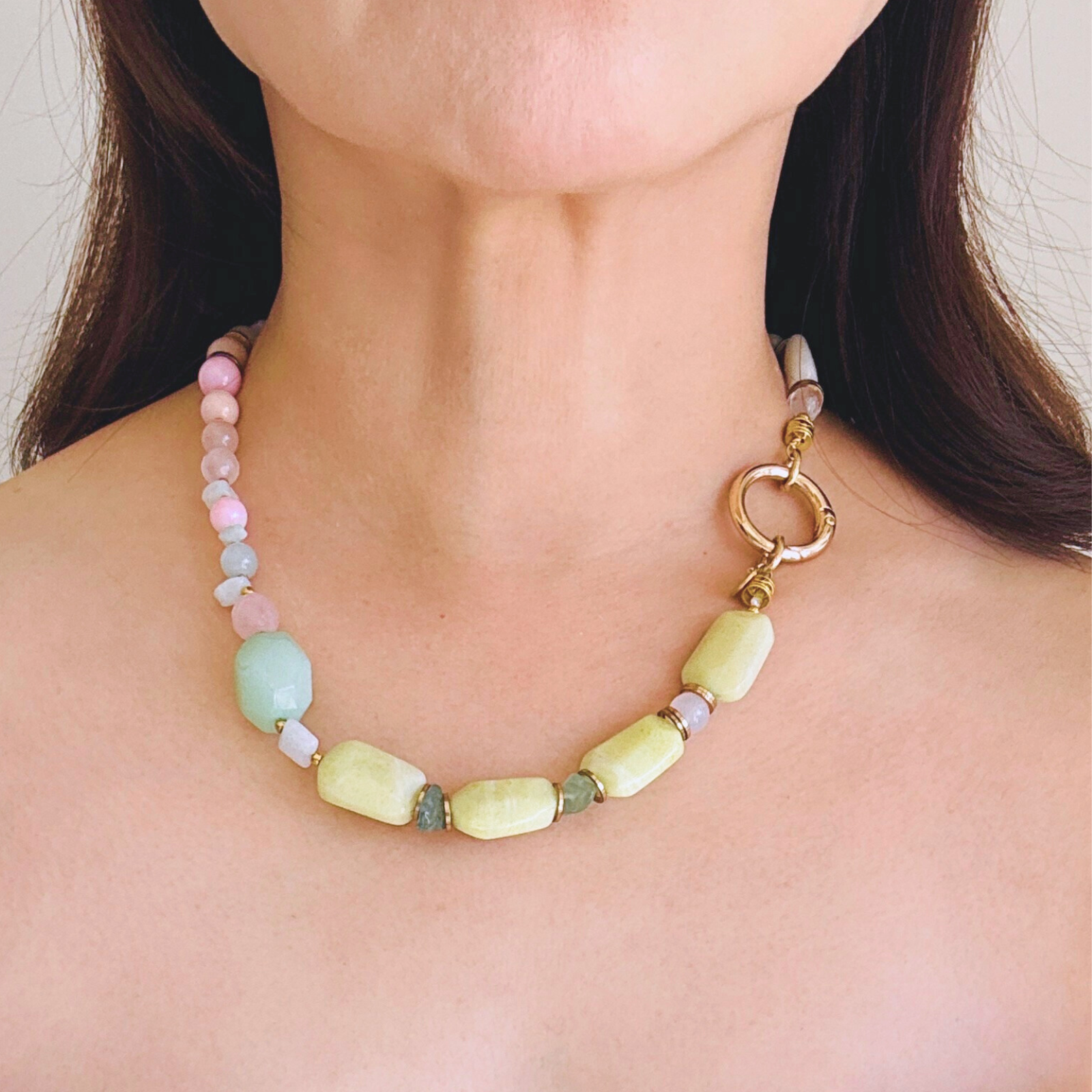 柔らかなマカロンカラーのカルセドニーを中心に、スモーキークォーツの深みを効かせた天然石ネックレス。
