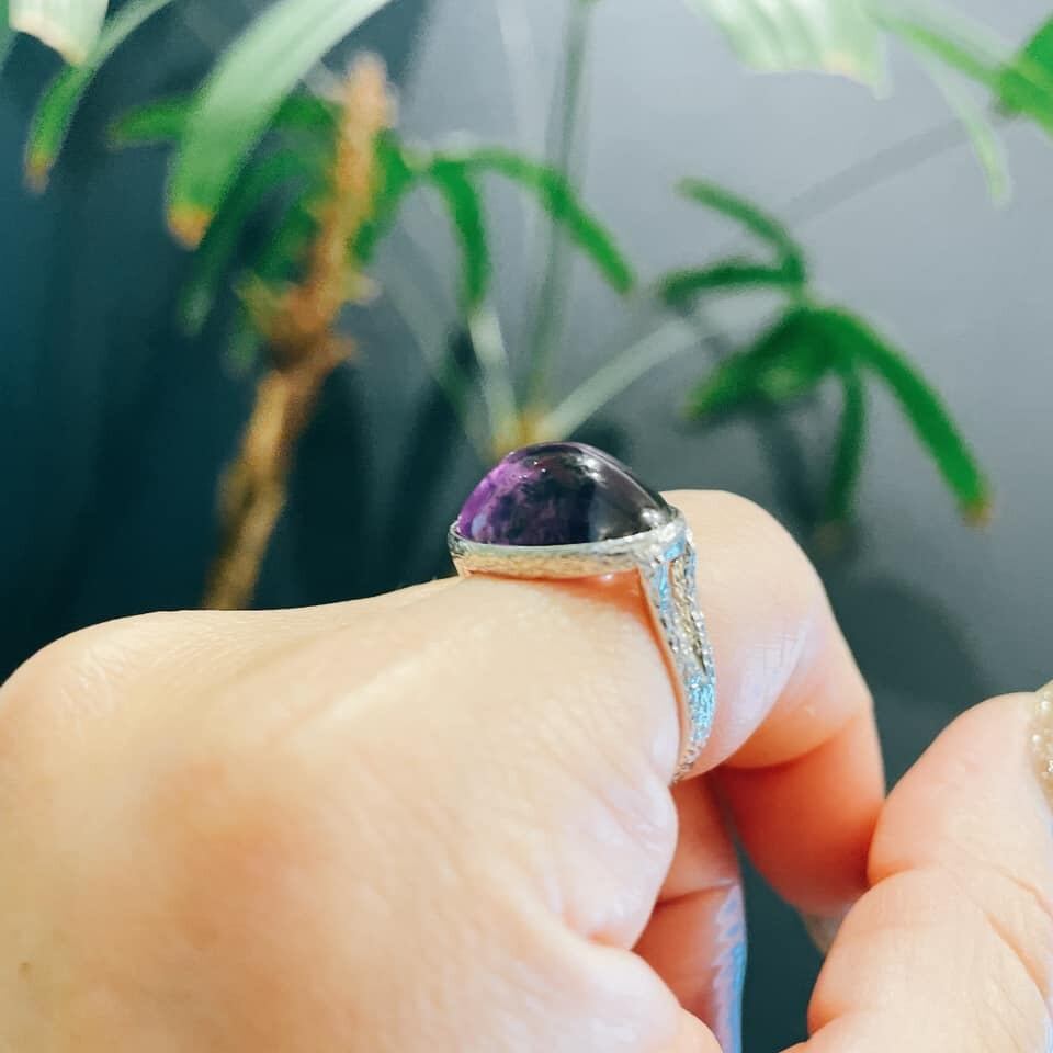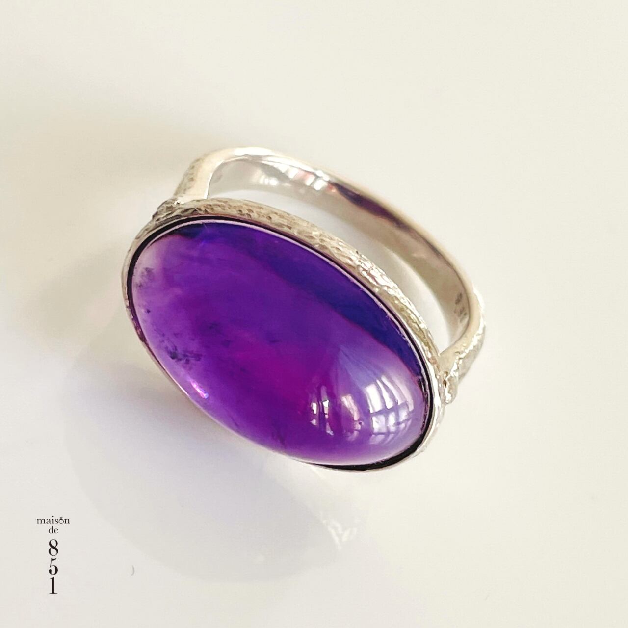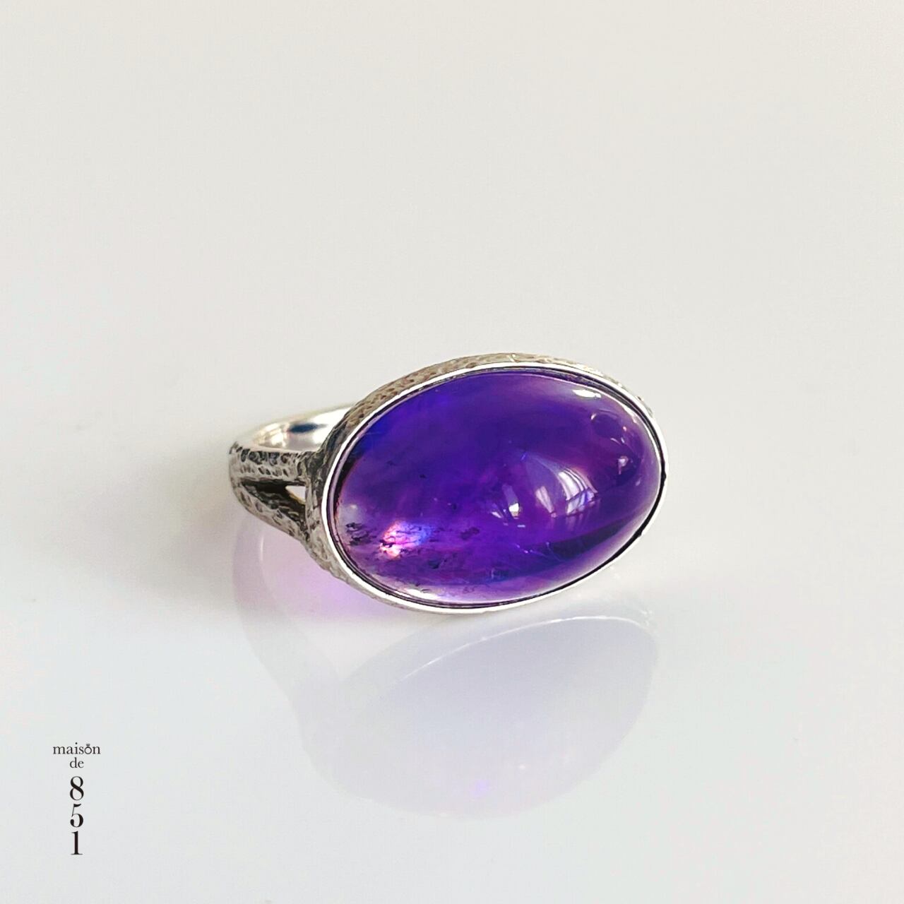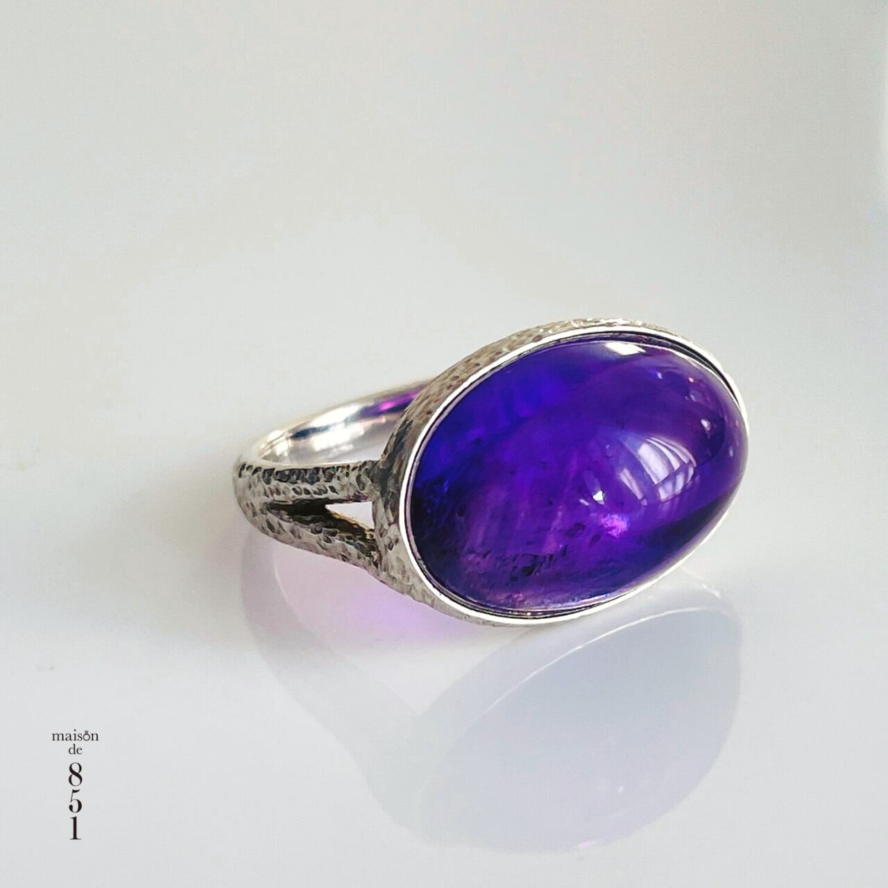 鮮やかなパープルのアメシストを使用したドロップタイプのアメジストリングのご案内です。