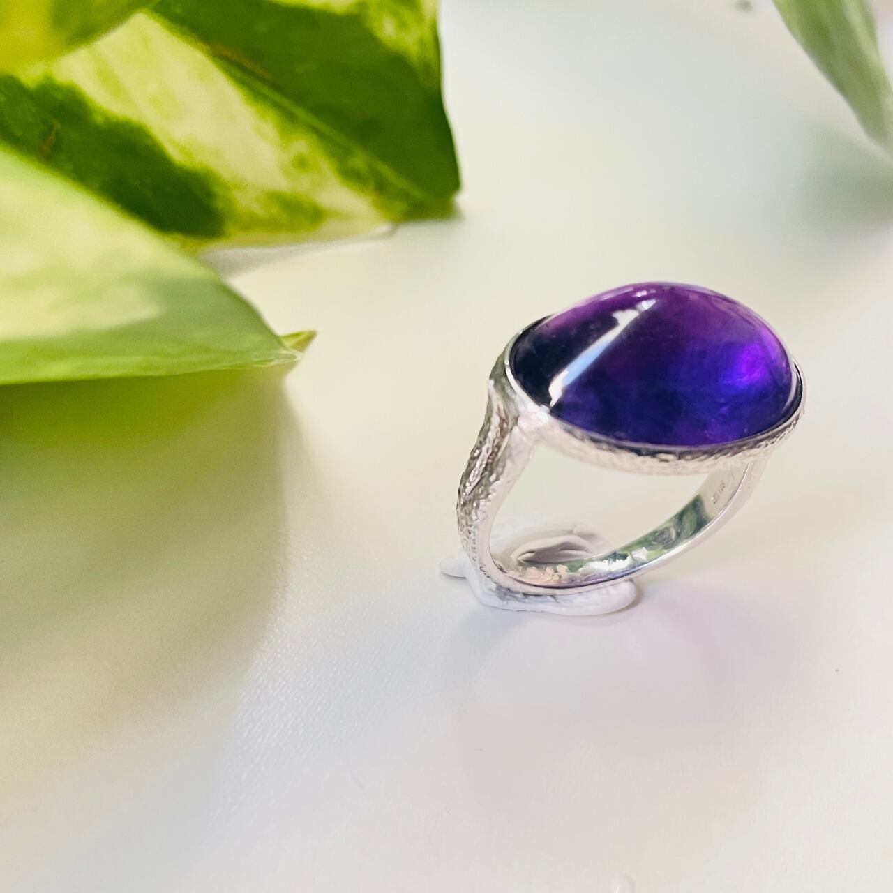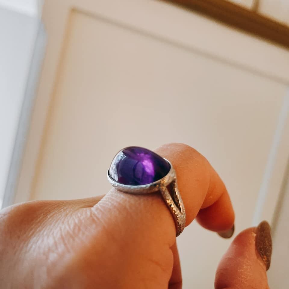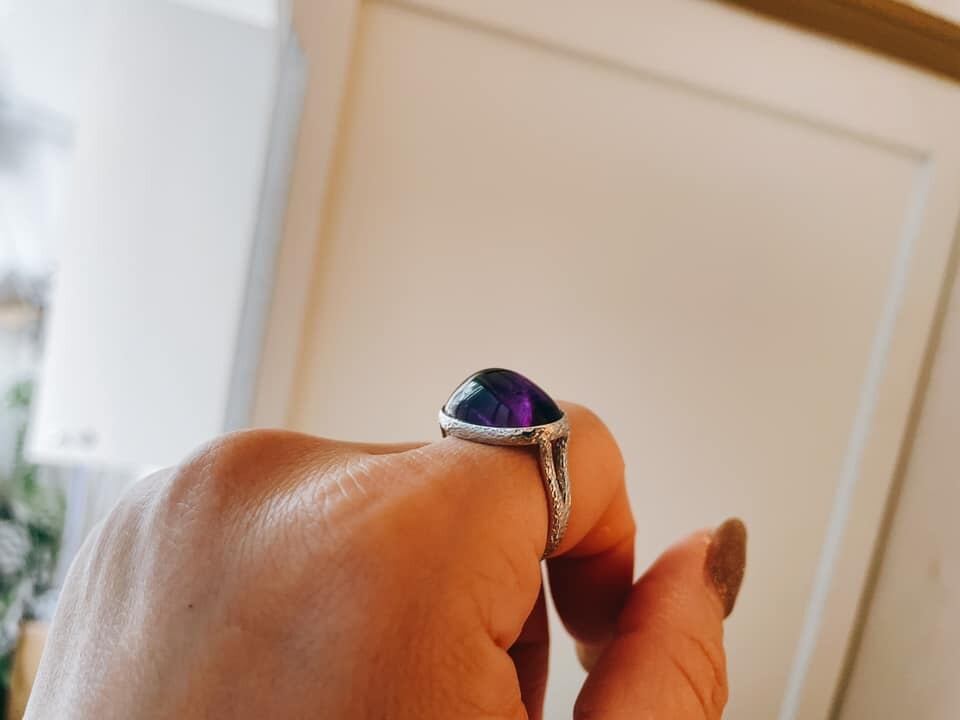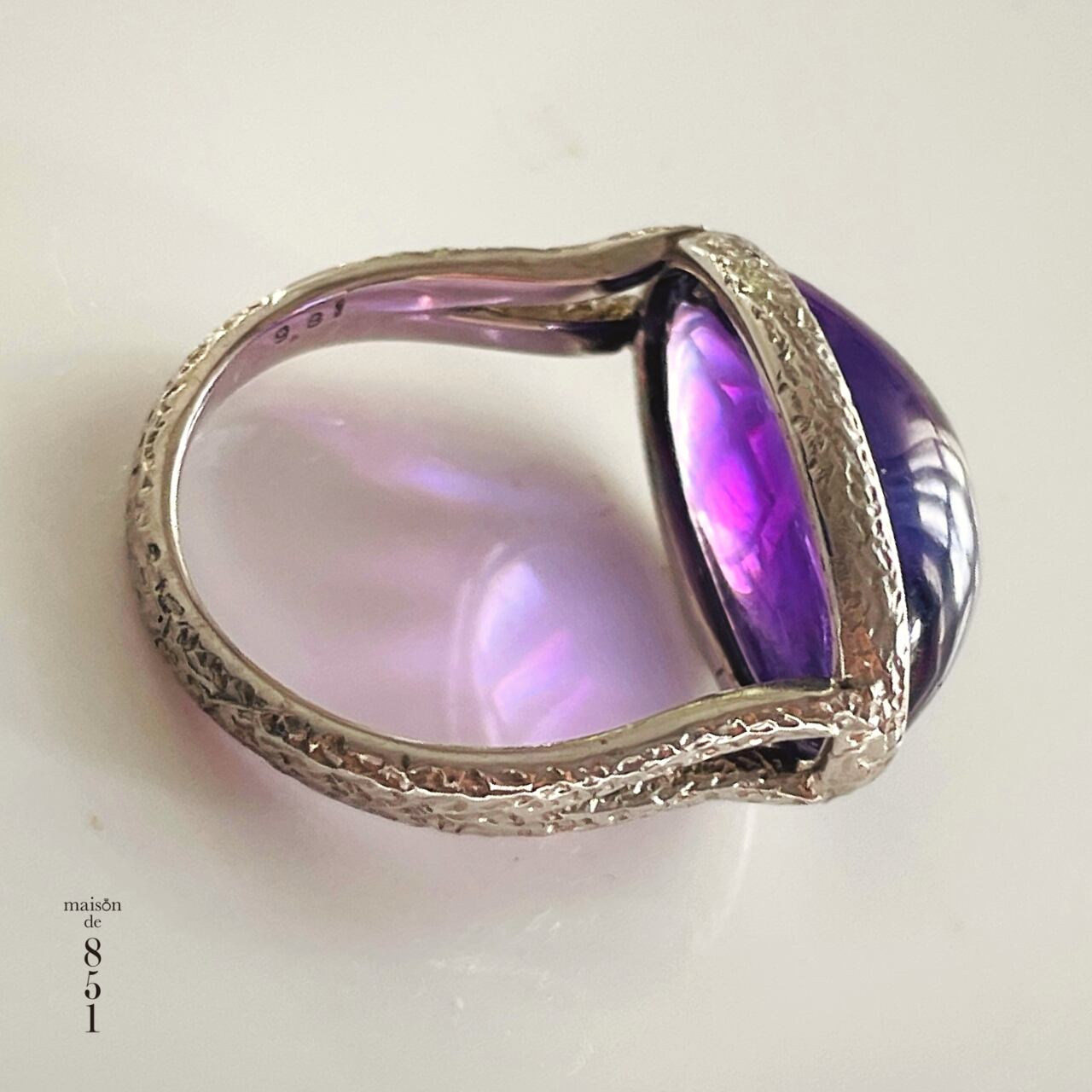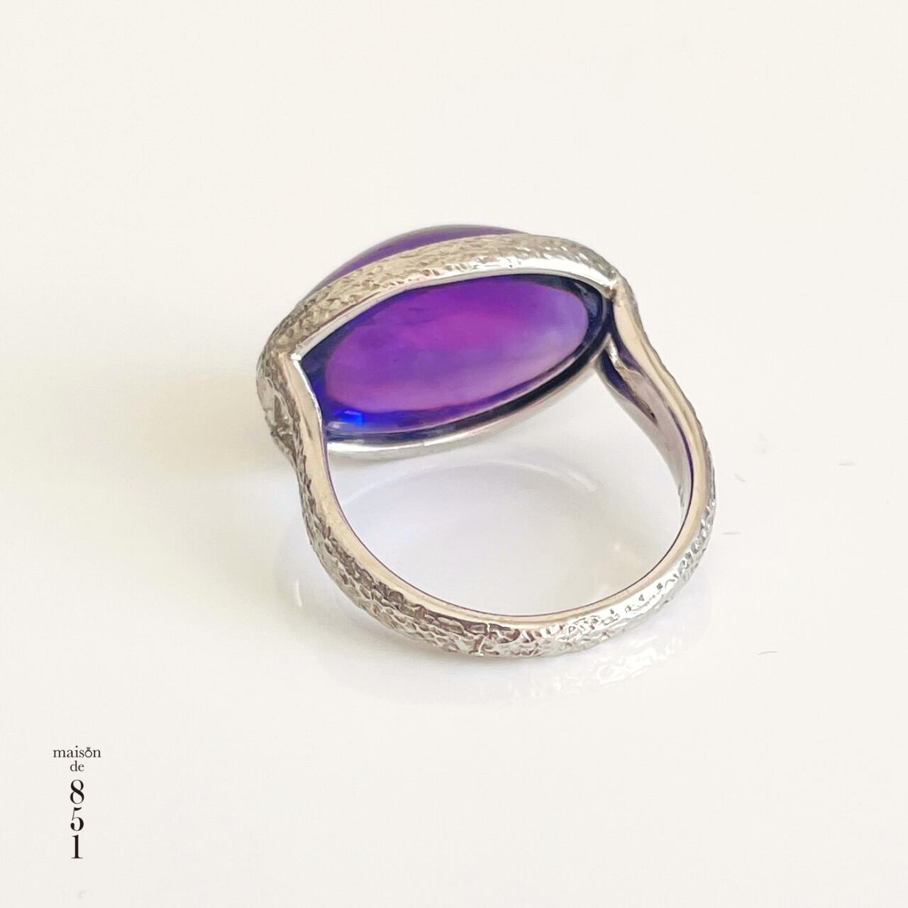 鮮やかなパープルのアメシストを使用したドロップタイプのアメジストリングのご案内です。