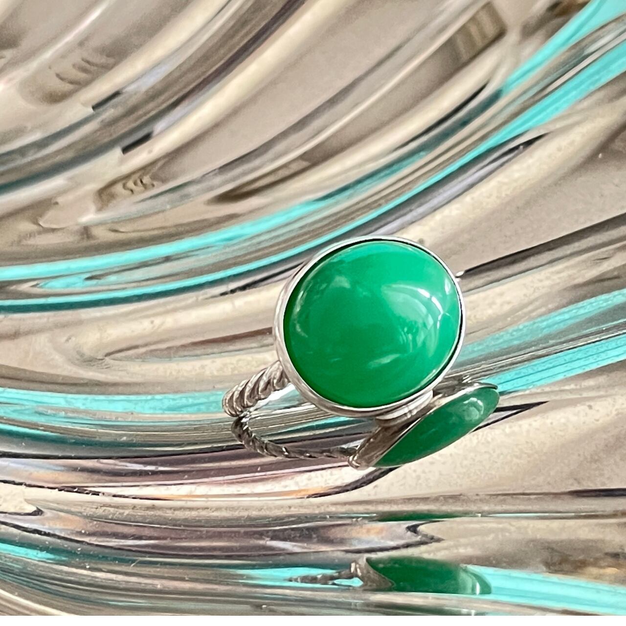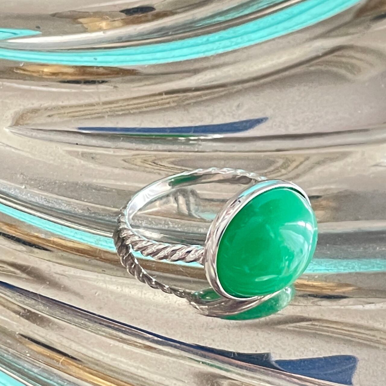 新緑の森の中にいるような癒しのグリーンに包まれる贅沢なクリソプレーズのリングをご紹介します。
