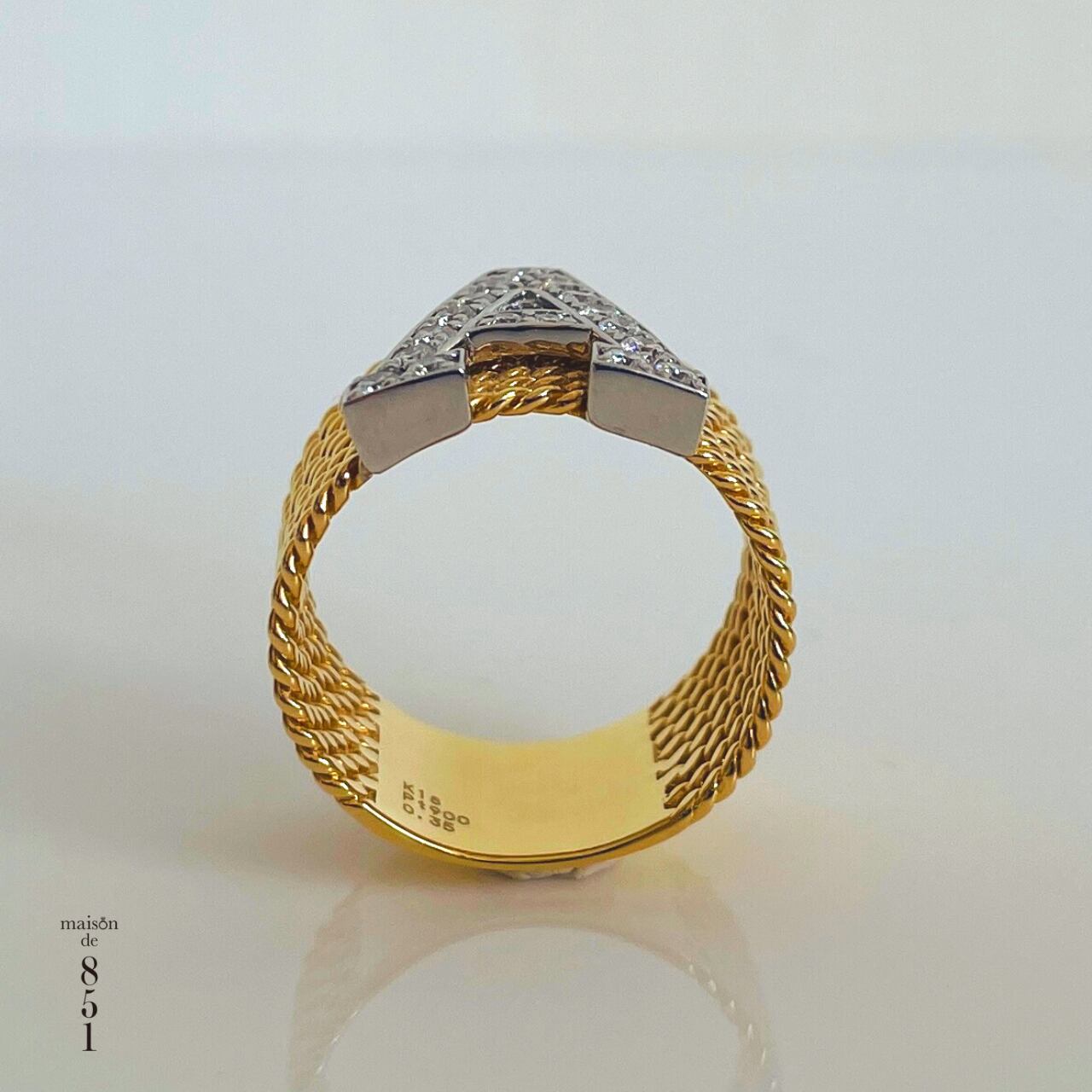 リング部分はイエローゴールド、ダイヤを配置している土台の地金はプラチナで立体感をプラス。