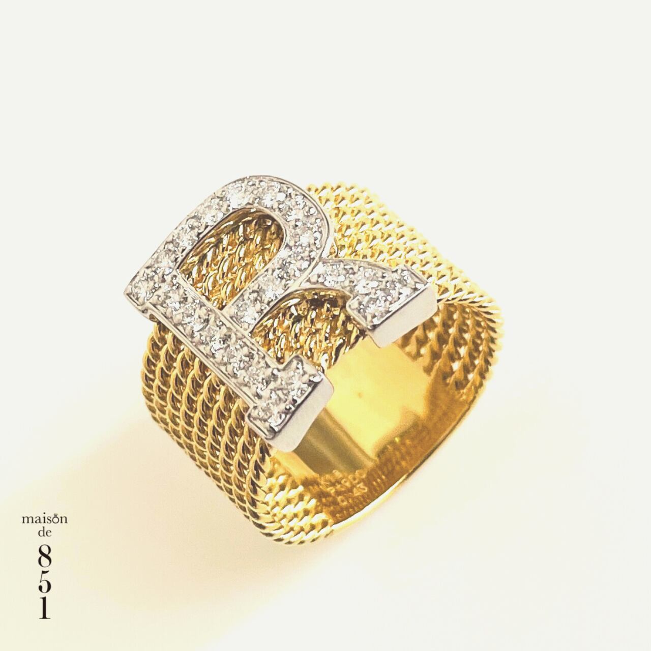K18ダイヤモンドイニシャルリング「R」 イエローゴールド&プラチナダイヤリング イニシャル 【サイズオーダー可能】