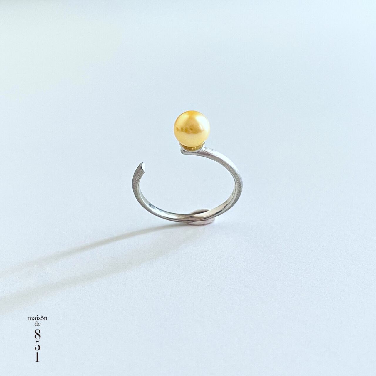 トップに配置されたゴールデンパールとサイドの一部がオープンになった851オリジナルリングは1本でもおしゃれで2本3本と重ねづけしても魅力的です。